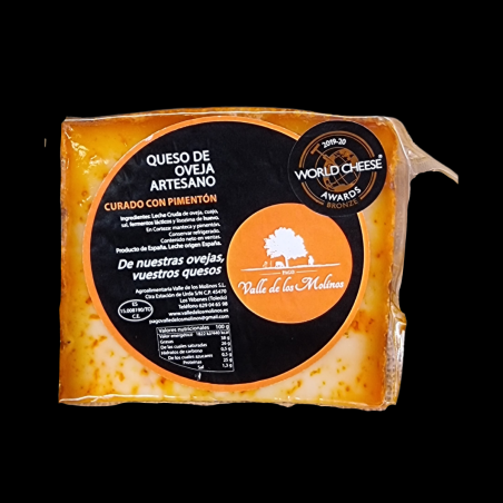 El Queso Curado al Pimentón, elaborado de manera artesanal con leche cruda de oveja por Valle de Los Molinos, es un auténtico deleite para los amantes del queso.