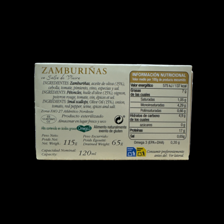 Las zamburiñas en salsa de vieira son una delicadeza del mar que combina el sabor suave y dulce de las zamburiñas con una exquisita salsa que realza su frescura. En cada lata encontrarás entre 16 y 20 piezas de este manjar, ideal para disfrutar como aperitivo o como parte de un plato principal. La salsa, elaborada con ingredientes seleccionados, complementa perfectamente la textura tierna de las zamburiñas, ofreciendo un equilibrio de sabores que deleitará a cualquier amante de los productos del mar. Disfrútalas frías o calientes, y deja que cada bocado te transporte a la costa.